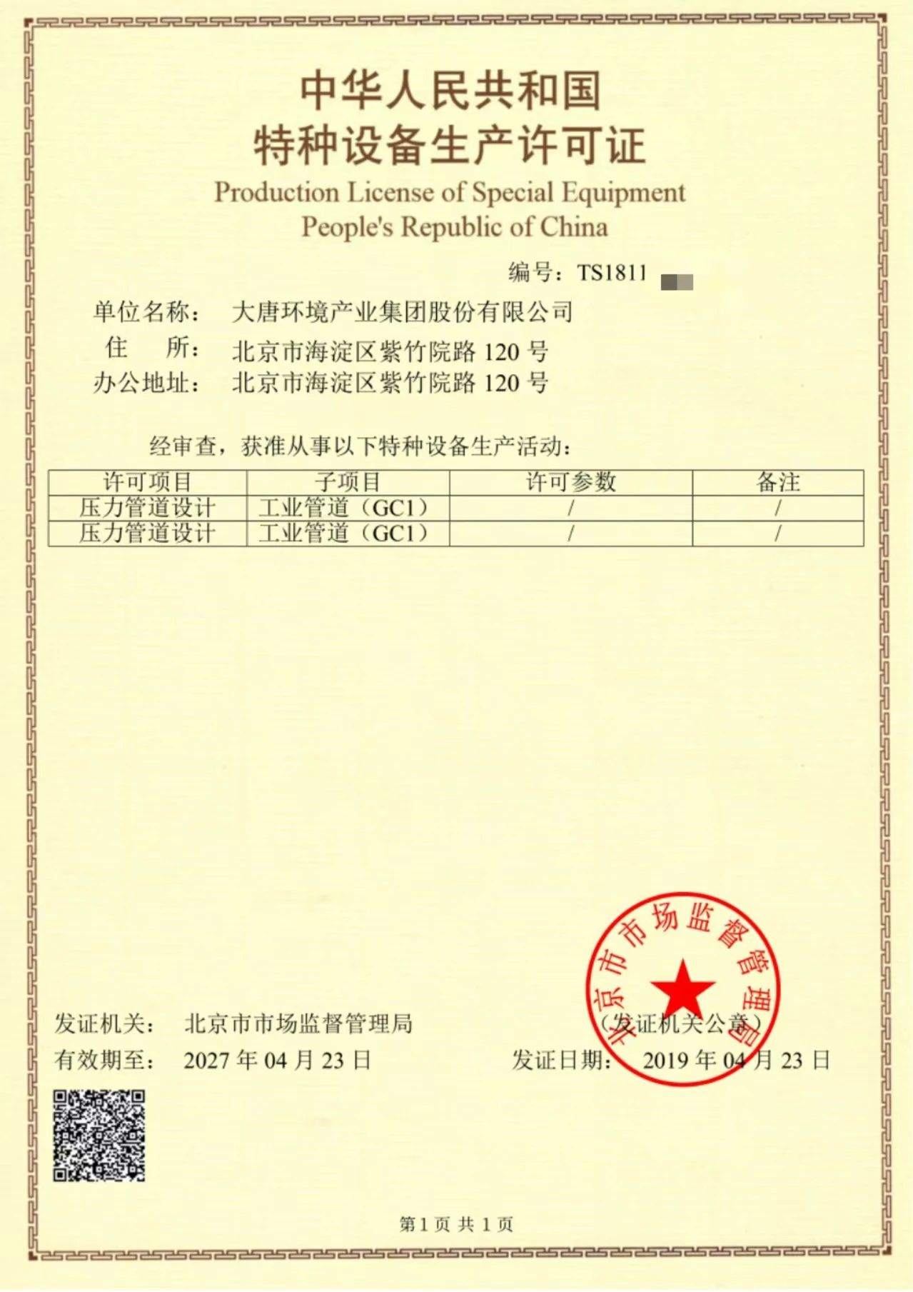 環(huán)保分公司成功升級特種設(shè)備生產(chǎn)許可證-壓力管道設(shè)計(GC1)資質(zhì)