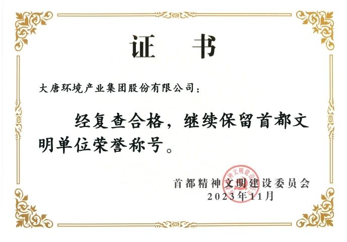 本網(wǎng)訊?近日,首都精神文明建設(shè)委員會頒發(fā)了“首都文明單位”復查合格證書,大唐環(huán)境產(chǎn)業(yè)集團股份有限公司繼2015年獲得“首都文明單位”稱號后,順利通過復查,連續(xù)保持9年“首都文明單位”稱號。
