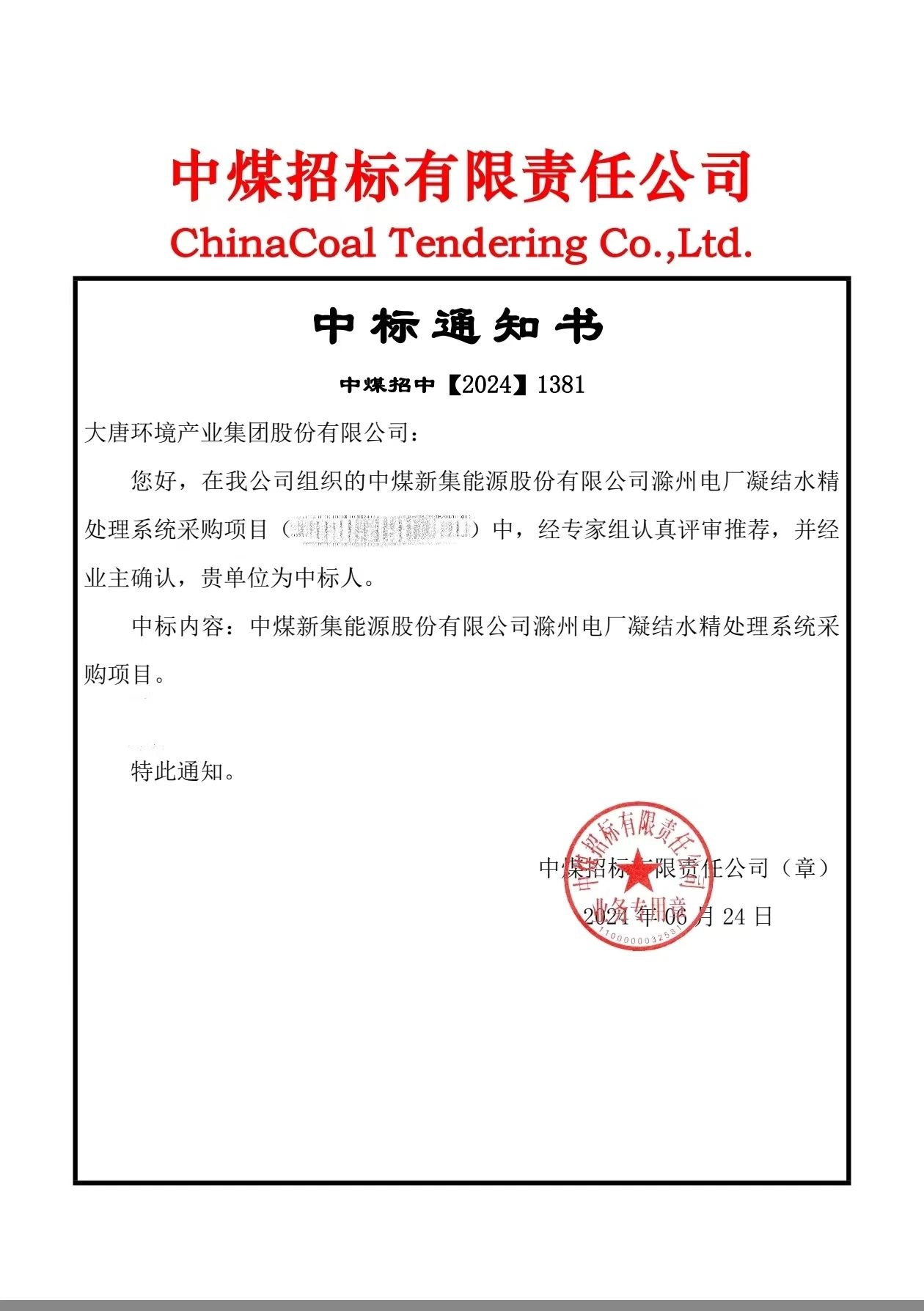 水務(wù)公司成功中標(biāo)中煤滁州電廠凝結(jié)水項(xiàng)目