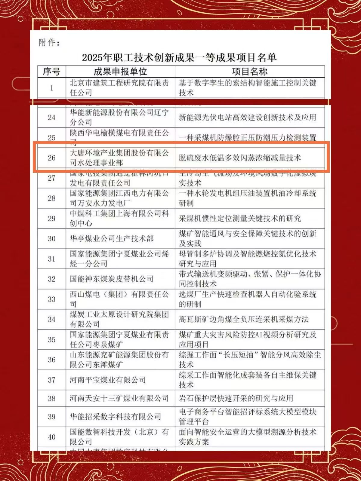 榮譽(yù)接踵而至。該技術(shù)成功入選集團(tuán)科技創(chuàng)新成果推廣手冊(cè),榮獲多項(xiàng)省部級(jí)與行業(yè)級(jí)科技大獎(jiǎng)。更為重要的是,它以卓越的性能和效益贏得了市場(chǎng)的廣泛認(rèn)可。從延安電廠出發(fā),這項(xiàng)技術(shù)已在大唐系統(tǒng)內(nèi)外的多家電廠的數(shù)十臺(tái)機(jī)組上成功應(yīng)用,累計(jì)為大唐環(huán)境帶來(lái)超億元的合同額。它不僅為應(yīng)用電廠帶來(lái)了顯著的經(jīng)濟(jì)效益和環(huán)保效益,更牽頭立項(xiàng)了相關(guān)團(tuán)體標(biāo)準(zhǔn),為高鹽廢水零排放領(lǐng)域樹立了嶄新的“大唐標(biāo)桿”。2025年,其核心子技術(shù)榮獲“中國(guó)職工技術(shù)創(chuàng)新一等成果”,成為集團(tuán)公司內(nèi)屈指可數(shù)的頂級(jí)職工創(chuàng)新榮譽(yù)。