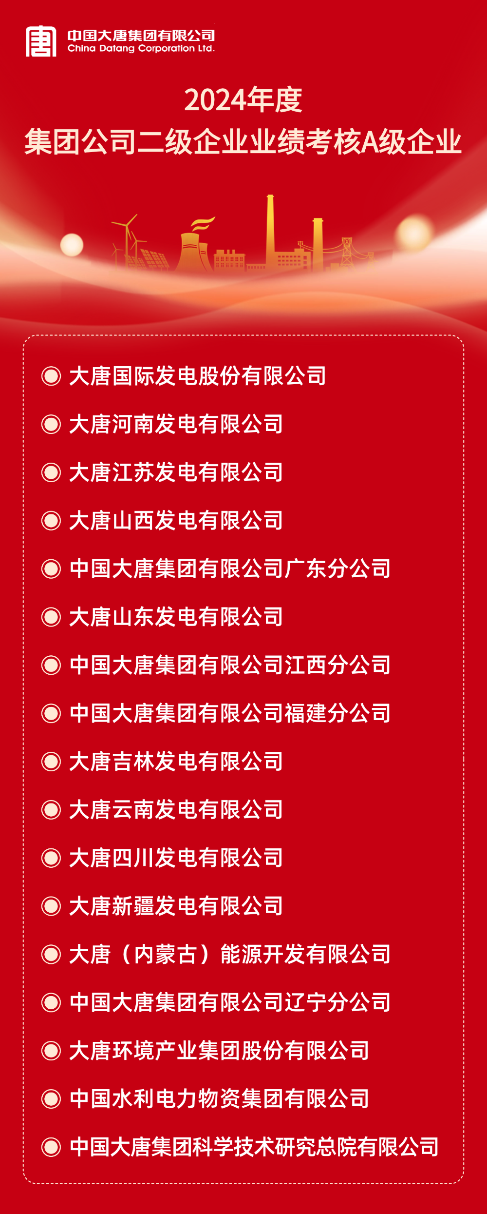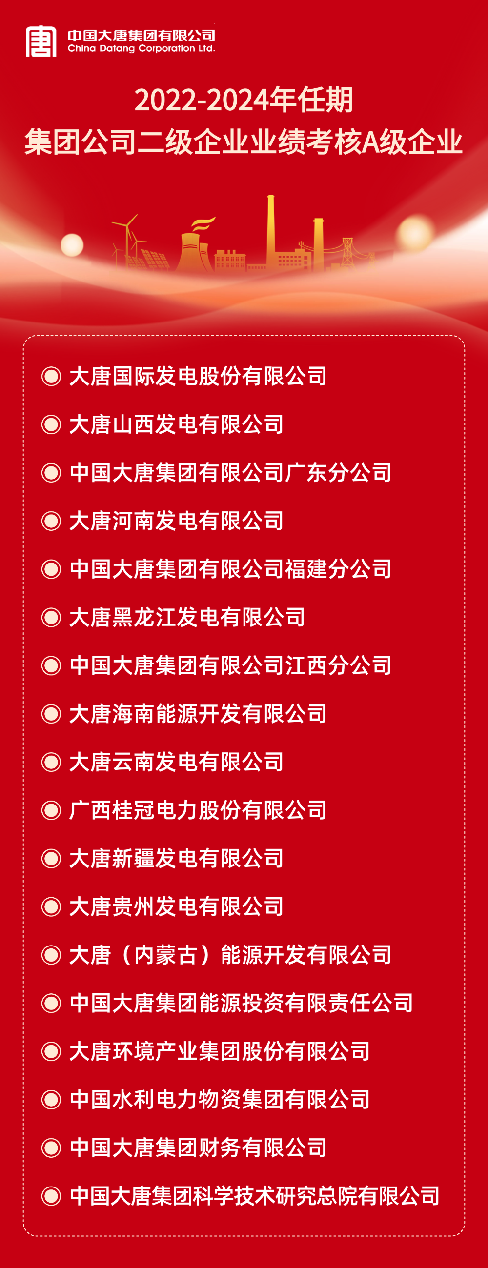 本網(wǎng)訊 根據(jù)《中國(guó)大唐集團(tuán)有限公司所屬企業(yè)年度業(yè)績(jī)考核辦法》和《中國(guó)大唐集團(tuán)有限公司所屬企業(yè)任期業(yè)績(jī)考核管理辦法(試行)》及有關(guān)規(guī)定,2024年度及2022-2024年任期二級(jí)企業(yè)業(yè)績(jī)考核結(jié)果已經(jīng)集團(tuán)公司董事長(zhǎng)專(zhuān)題會(huì)審議通過(guò)。A級(jí)企業(yè)名單如下: