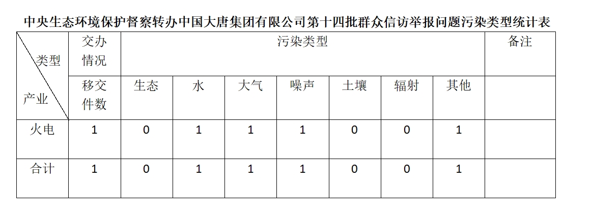 2025年6月20日,中央第七生態(tài)環(huán)境保護(hù)督察組向中國大唐集團(tuán)有限公司移交第十四批群眾信訪舉報(bào)件,共計(jì)1件,為來電舉報(bào),涉及水問題1個、大氣問題1個、噪聲問題1個、其他問題1個。所有舉報(bào)件辦理工作已第一時間進(jìn)入調(diào)查核實(shí)辦理程序,辦理情況將按照相關(guān)要求反饋督察組,并及時向社會公開。