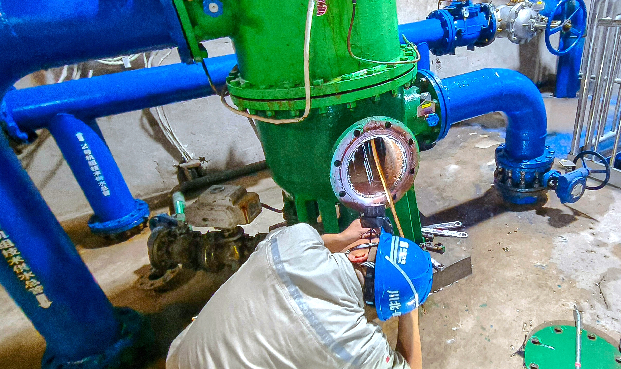 濾水器沉重的頂蓋被兩人合力打開——眼前的景象令人心頭一沉:濾網(wǎng)已被厚厚的泥沙完全糊死,枯枝、塑料袋死死卡在網(wǎng)眼深處,密不透光。