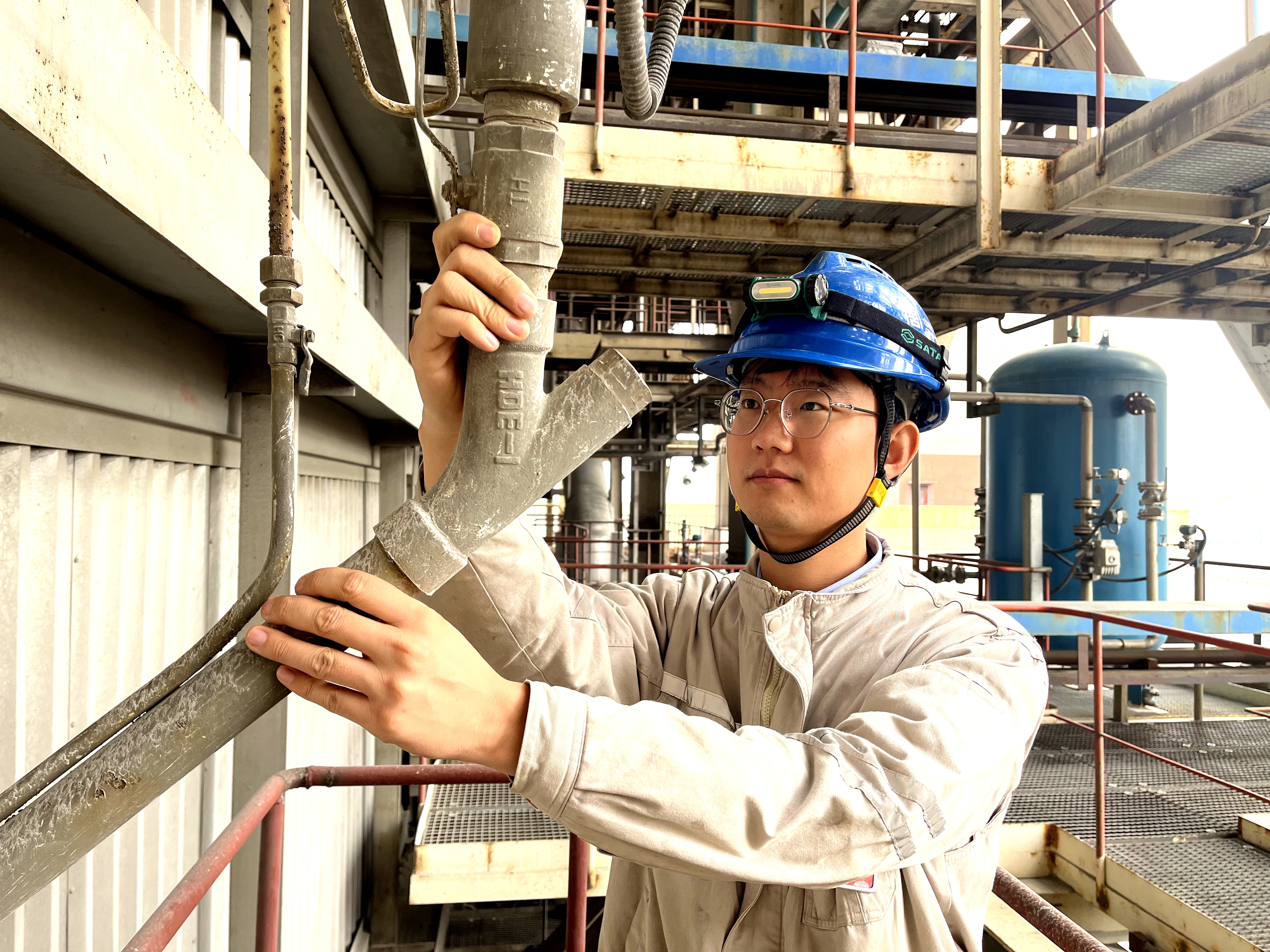 第一站是鍋爐房8米平臺(tái)。段科宇在轟鳴的設(shè)備間穿行,費(fèi)了一番功夫,在一根粗大管道后面找到編號(hào)為7號(hào)的傳感器。他需要檢查它的外觀是否完好,連接線纜有無(wú)老化,并記錄運(yùn)行參數(shù)。