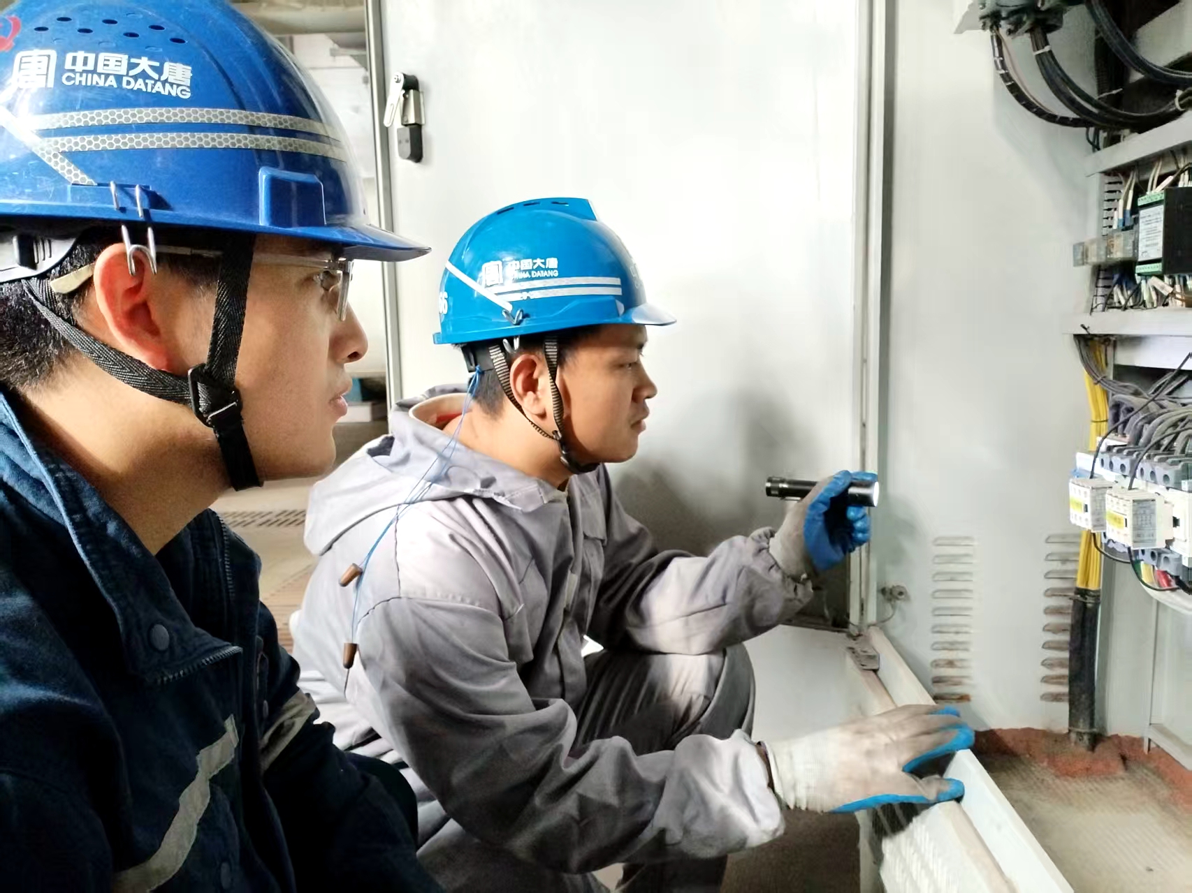 天邊烏云彌漫,雨還在一直下個(gè)不停。一行人深一腳淺一腳?過周邊的泥濘,抵達(dá)中水泵控制箱處。雨絲鞭打著電氣班長(zhǎng)小管沉穩(wěn)的面龐,他鉆在防雨棚下,借著手電的光,仔細(xì)地查看著控制柜內(nèi)的情況。