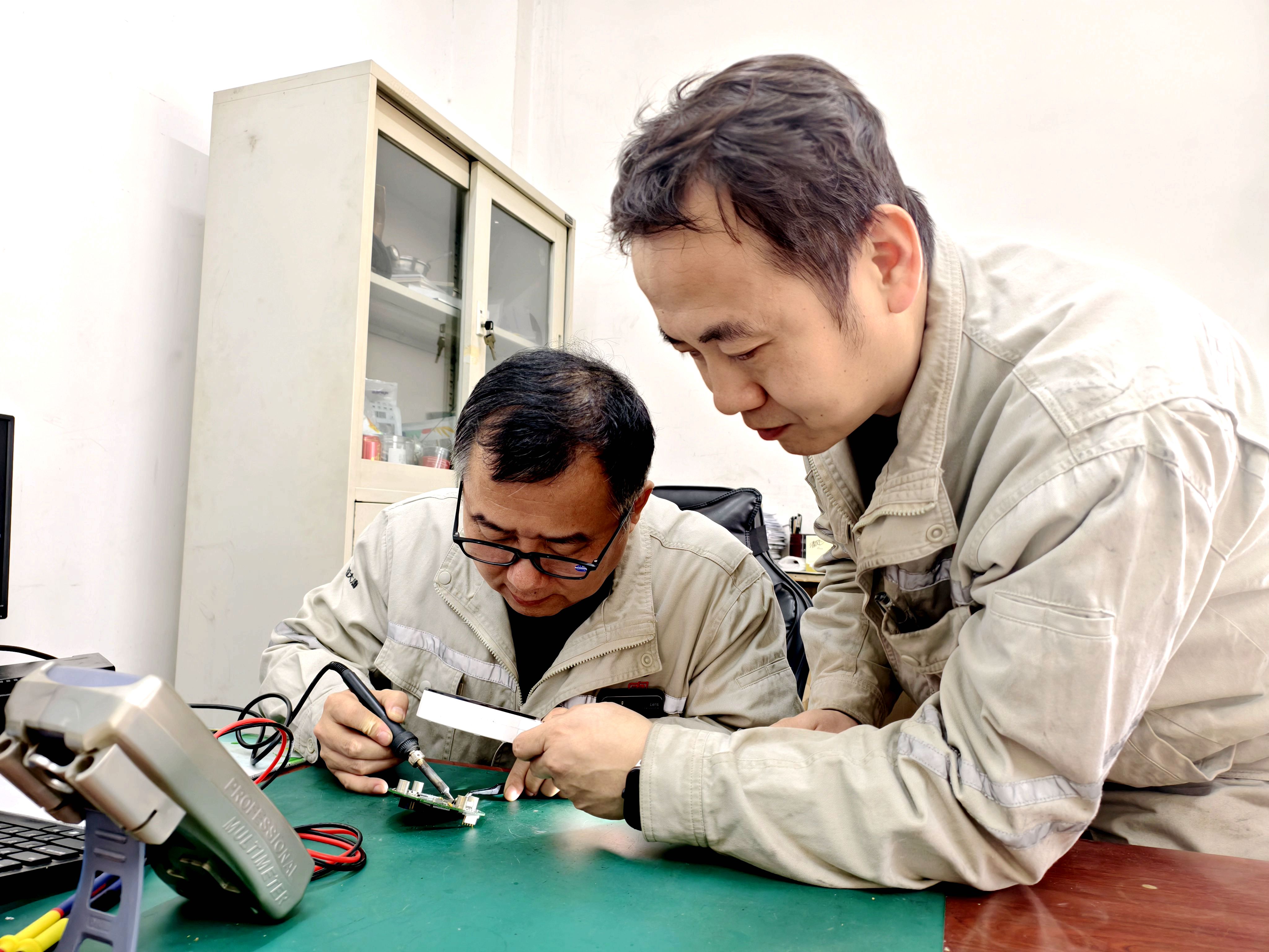 手術開始!檢修間里格外安靜,依稀聽見操作時的細微聲響。只見他們手持放大鏡,雙眼緊緊聚焦在電路板上,每一個操作都精準而細致。他們小心翼翼地清理燒毀的殘留部件,逐一識別新元器件的正負極。既要用力均勻讓元器件牢牢固定在電路板上,不能出現虛焊情況;又要精準控制電烙鐵的火候保證焊錫充分融化貼合,嚴防高溫對周邊元器件造成二次傷害,影響整體電路運行。