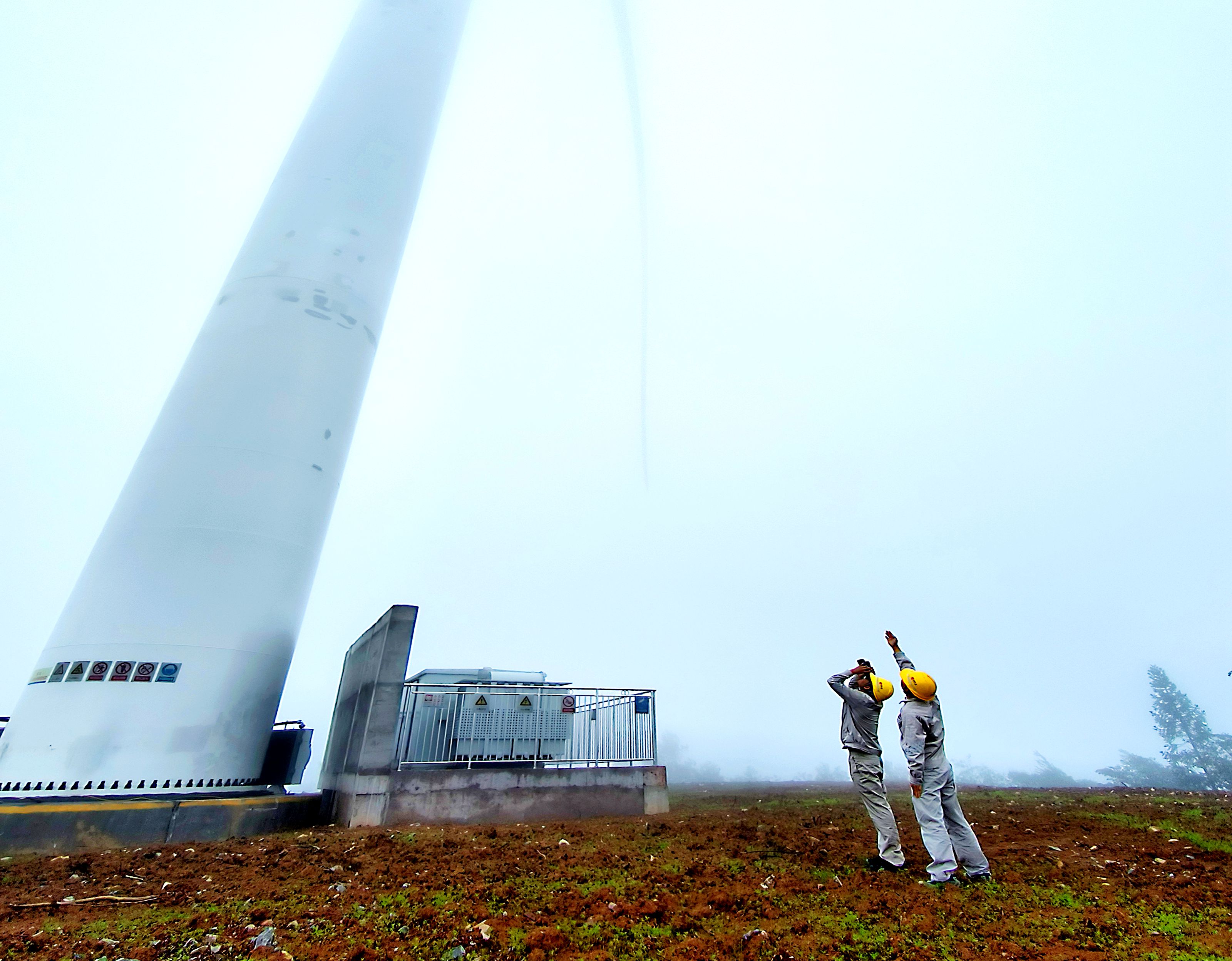 一陣山風(fēng)吹來,站在風(fēng)機(jī)塔下,幾個人都不由自主地緊了緊身上的大衣。云霧迅速流動了起來,風(fēng)機(jī)的三個葉片和整個塔筒,慢慢從云霧中露出了“真容”。