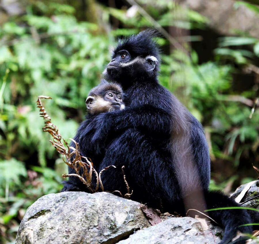 經(jīng)過(guò)長(zhǎng)途奔波,快艇行駛到貴州省沿河縣境內(nèi)的“麻陽(yáng)河國(guó)家級(jí)自然保護(hù)區(qū)”。山上傳來(lái)各種表達(dá)不同“情緒”的叫聲,在生態(tài)環(huán)保專業(yè)崗位奮斗8年之久的饒振祺朝密林中一指:“快看,那就是黑葉猴!發(fā)出‘嘎,嘎’的叫聲,說(shuō)明它們處在愉快的覓食狀態(tài)中;‘噢、噢’就是它們?cè)谏搅珠g攀援前進(jìn)的信號(hào)。”抬眼望去,巖石間、樹蔭深處不斷有黑葉猴迅捷地跳躍。它們頭頂冠毛蓬松,通體黑色,兩頰雪白的“絡(luò)腮胡”格外醒目,看起來(lái)像銀須飄飄的“小老頭”。有的黑葉猴懷里還抱著“金寶寶”——幼猴毛色金黃,隨年齡增大變黑。