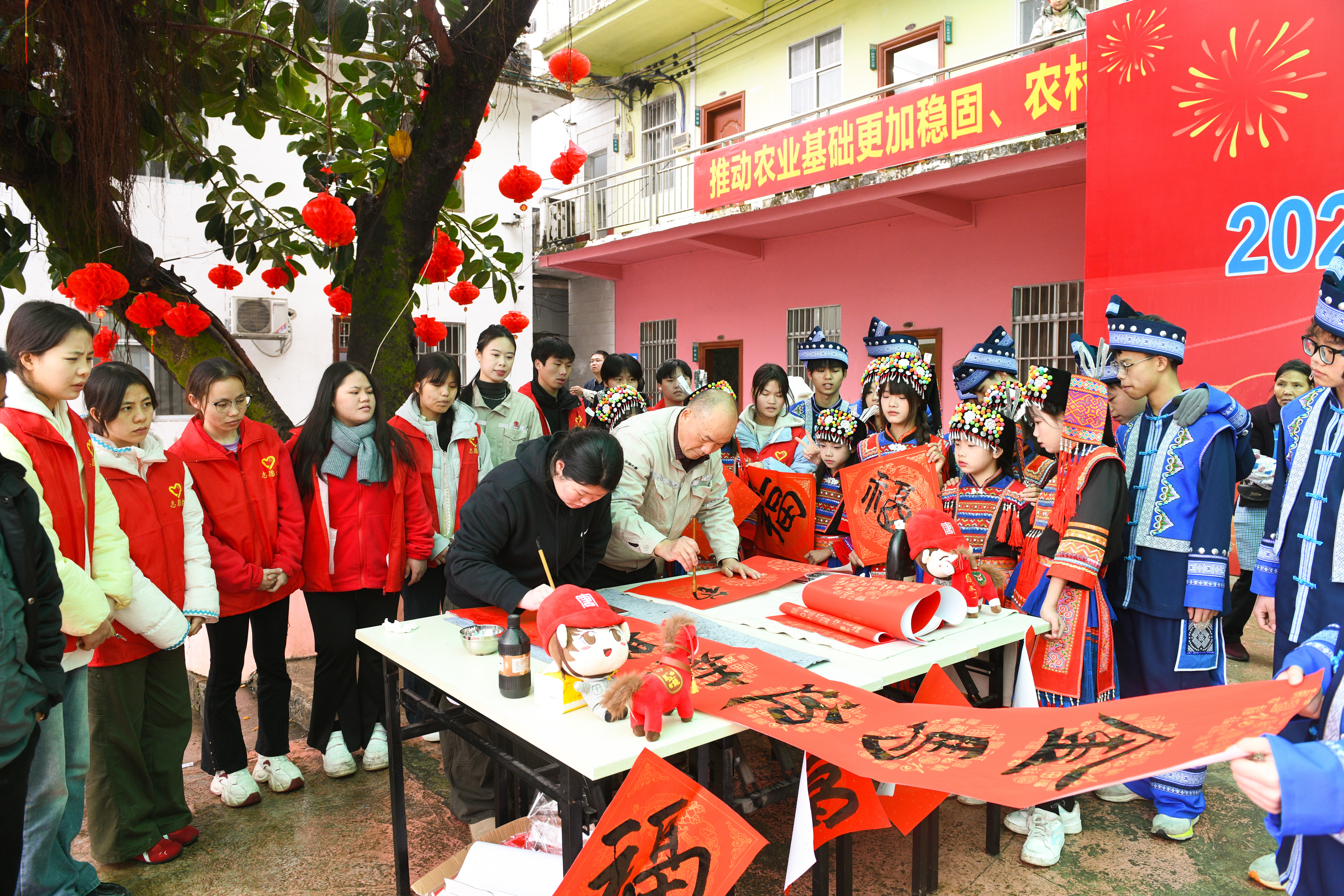 “大唐織錦鋪富強(qiáng),板蘭鳴琴奏和音”,橫批“錦繡前程”——墨跡未干,已引來一片喝彩。在板蘭村古榕樹下,來自后盾單位大化總廠的職工與板蘭村書法愛好者一同揮毫,紅紙翻飛間,一副副寓意吉祥的春聯(lián)躍然紙上。