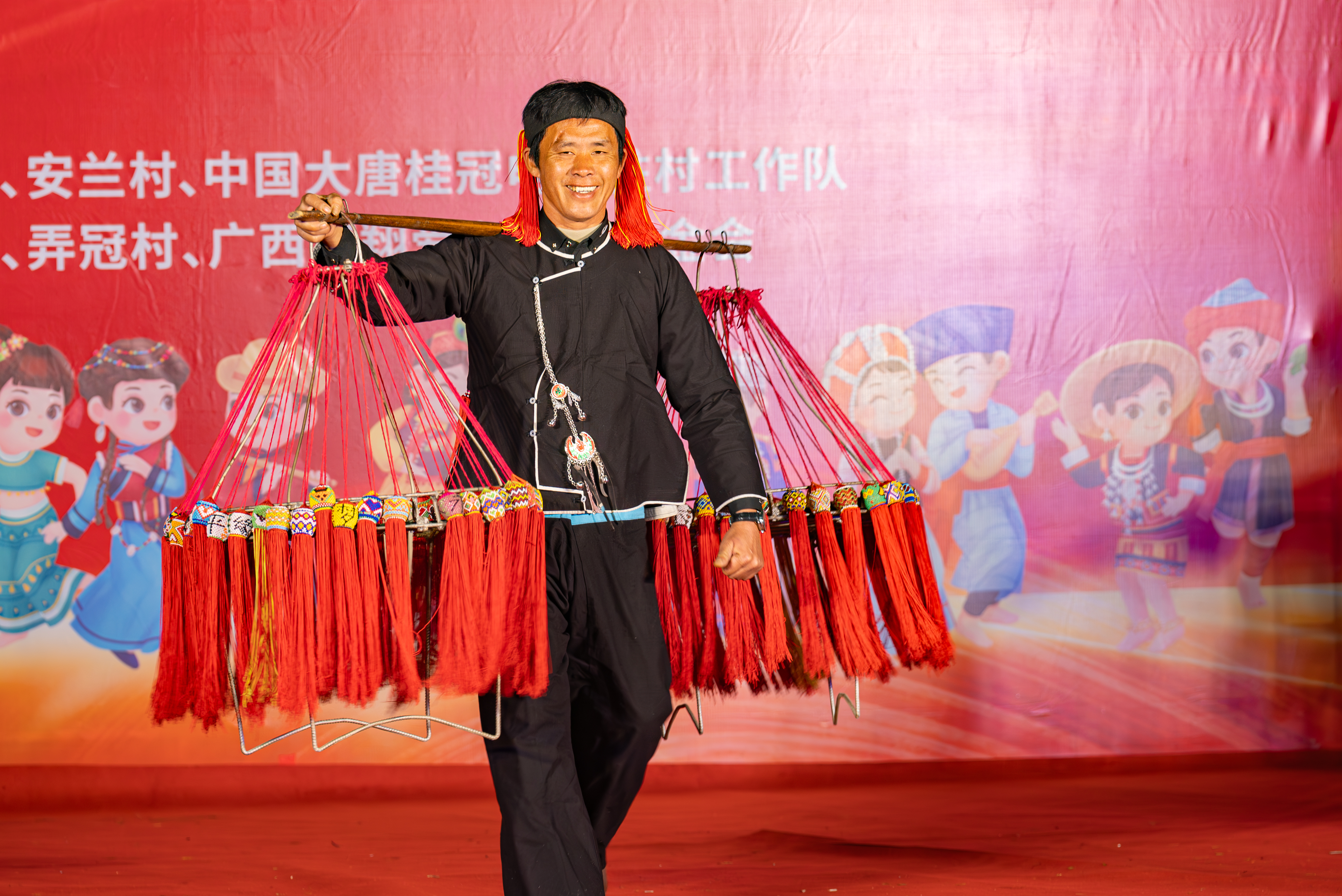 晚會(huì)高潮由板蘭村弄英屯的康凡老師與其他學(xué)生帶來。這位曾獲得夢想劇場冠軍、現(xiàn)任巴馬縣第五小學(xué)的音樂老師,用瑤話和普通話交織演繹《飛歌迎賓》《家鄉(xiāng)》《我要抱著你》等歌曲,那悠揚(yáng)深沉的歌聲如山間百靈般,載著游子對(duì)故土的眷戀,溫暖了每一個(gè)人的心靈。